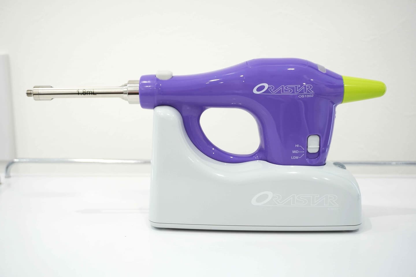 当院では、治療時の痛みをできる限り軽減するため、電動麻酔注射器を導入しています。麻酔液を一定の速度と圧力で注入できるため、手動注射に比べて刺激が少なく、痛みを感じにくいのが特長です。麻酔時の不安や緊張を和らげ、歯科治療が苦手な方や痛みに敏感な方にも、安心して治療を受けていただける環境づくりを心がけています。