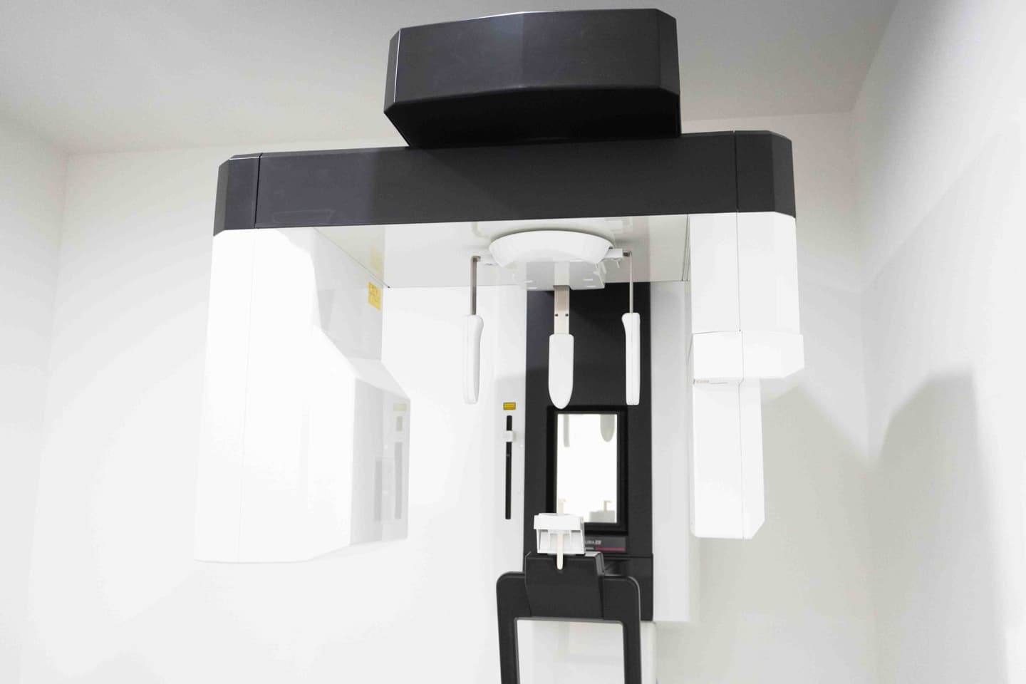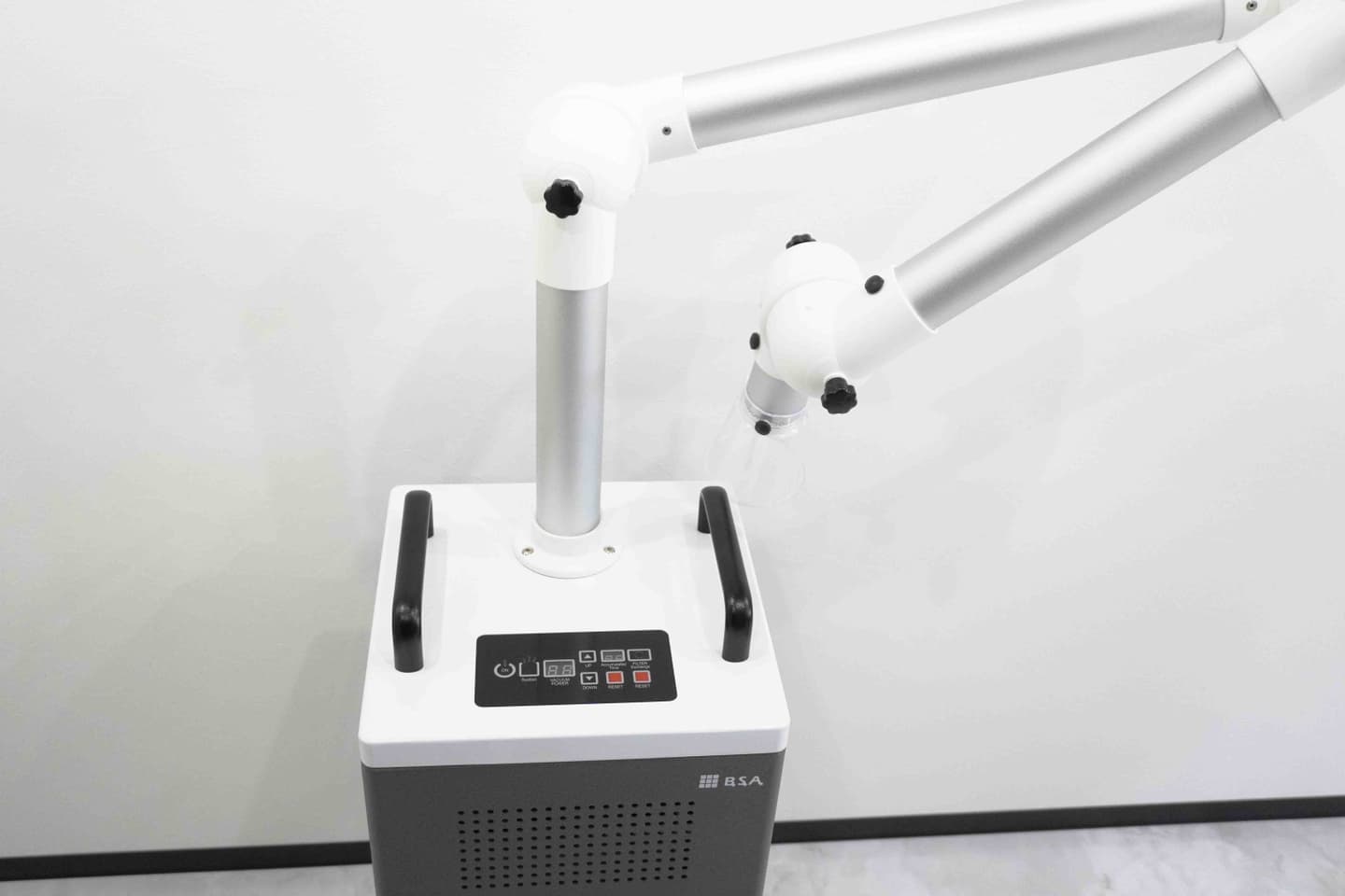 当院では、院内感染対策の一環として口腔外バキュームを設置しています。治療中に発生する唾液や血液、歯の削りかす、目に見えないエアロゾル(飛沫)をお口の外で強力に吸引し、診療室内への拡散を防ぎます。