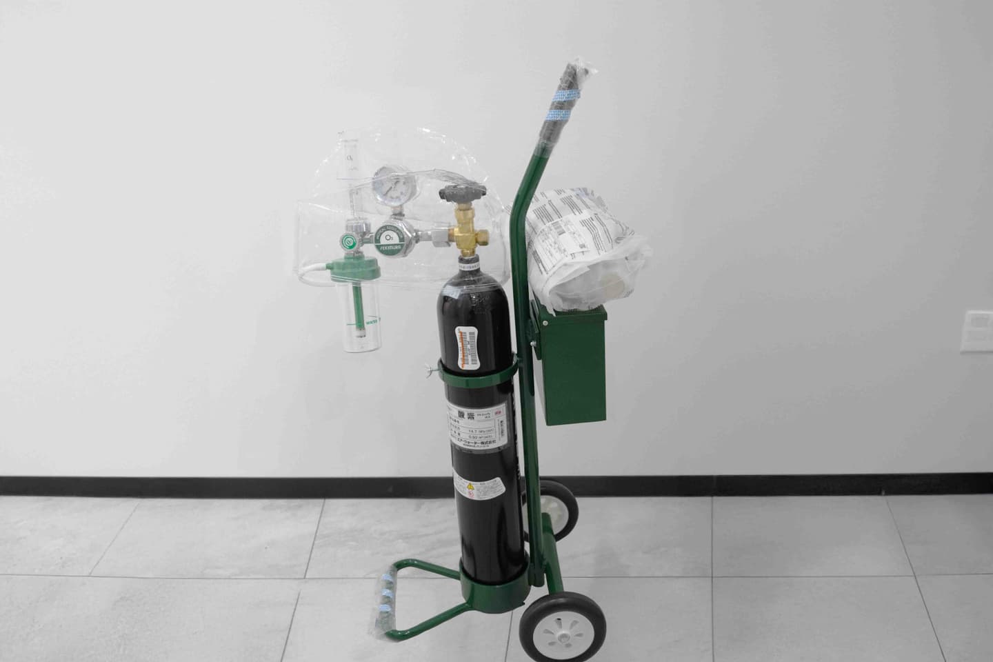 当院では、治療中や治療前後に体調の変化が起こった場合にも速やかに対応できるよう、酸素吸入器を常備しています。緊張や不安、体調不良などにより息苦しさを感じた際にも、落ち着いた対応ができる体制を整えています。万が一の緊急時には、AEDや緊急蘇生セットと併用し、患者さまの状態に応じた適切な初期対応を行います。